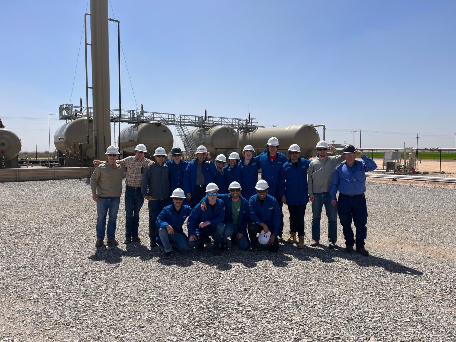 Professors Mike Stafford and Dr. Mohan Kelkar accompanied a group of 13 Petroleum Engineering Seniors in their final semester of their undergraduate degree to the ABU field office located near Geary, OK. The excursion began with introductions and a comprehensive safety briefing at the field office before the group split into two to venture out into the field.