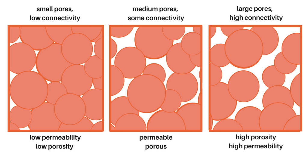 Porosity determines how large a rock’s pores, or spaces between sediments are.  Permeability tells us how interconnected a rock’s pores are, which is how materials like gas and water flow through rocks. Rocks with no permeability are like Swiss cheese: there are large pores, but the pores are unconnected and gases cannot escape. A bowl of Cheerios, on the other hand, has large holes and lots of permeability where milk can flow.