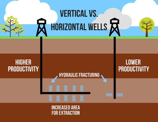 While vertical drilling only reaches one small area of rock deep below the surface, horizontal drilling increases the area that the well touches. The increased area allows for more natural gas resources to be accessed using hydraulic fracturing – up to a mile underground and a mile horizontal.