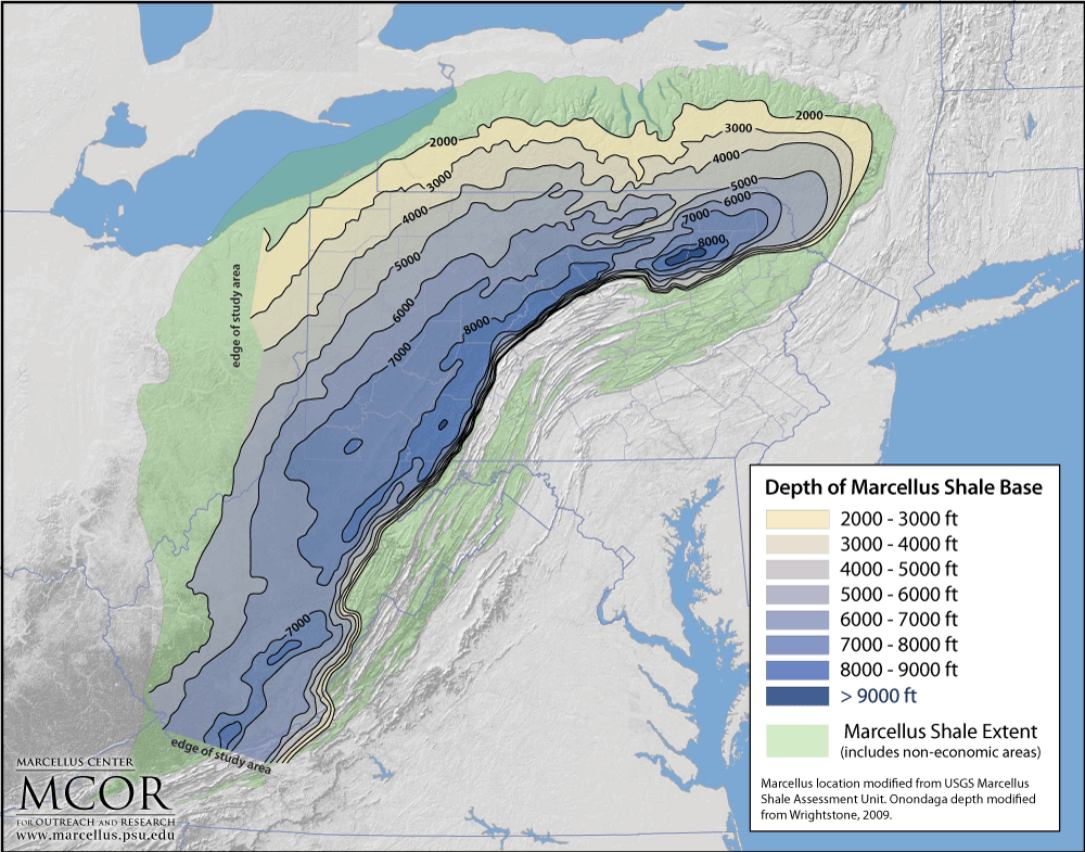 The entire process took around 390 million years. Now, the Marcellus formation rests around one mile under the surface and can be hundreds of feet thick.